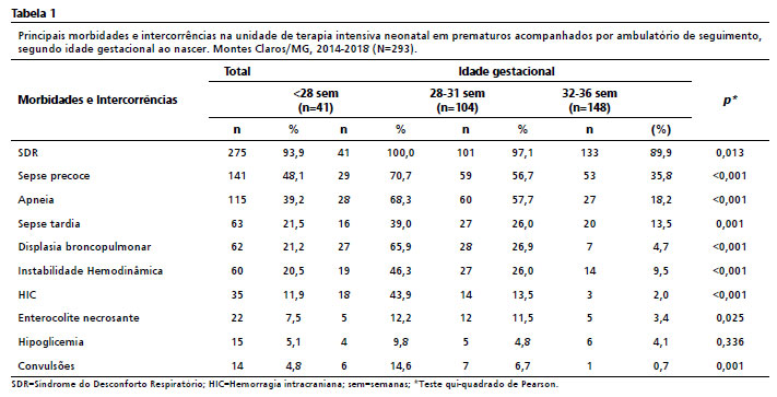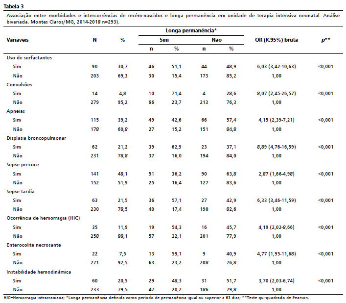 RESULTS: 293 newborns participated in this study, 56.6% of whom were male. The gestational age of the group ranged from 24 to 36 weeks, and 25.3% were extremely preterm. The main morbidities were related to respiratory and infectious disorders. Long stays were recorded for 25.9% of preterm newborns and the associated factors were gestational age (p<0.001), birth weight (p<0.001), late-onset sepsis (p<0.001) and necrotizing enterocolitis (p=0.036).