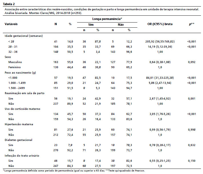 A permanência em UTIN para o grupo avaliado variou de três a 347 dias, com mediana de 37 dias. No total de RN, 76 (25,9%) apresentaram período de permanência igual ou superior a 63 dias (último quartil para o total de dias de hospitalização), definindo longa permanência na UTIN. A Tabela 2 apresenta os resultados das análises bivariadas entre características do recém-nascido e condições de gestação e nascimento e a longa permanência.