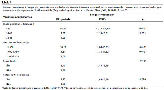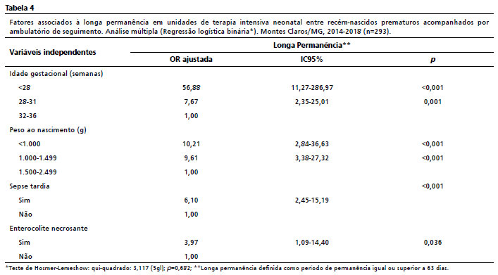 Após análise múltipla as variáveis: idade gestacional, tanto menor de 28 semanas (OR=56,88; IC95%=11,27-286-97; p<0,001), como de 28 a 31 semanas (OR=7,67; IC95%=2,35-25,01; p=0,001); o peso ao nascimento, tanto o menor de 1000g (OR=10,21; IC95%=2,84-36,63; p<0,001), como de 1000g a 1499g (OR=9,61; IC95%=3,38-27,32; p<0,001); a sepse tardia (OR=6,10; IC95%=2,45-15,19; p<0,001) e o registro de enterocolite necrosante (OR=3,97; IC95%=1,09-14,40; p=0,036) mantiveram associação estatisticamente significante com a longa permanência (Tabela 4).