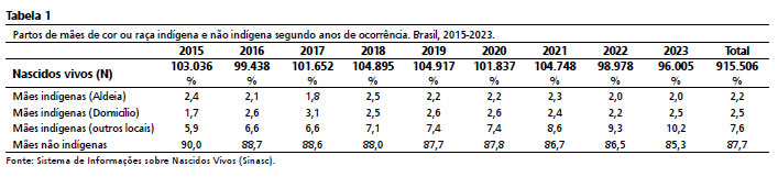 ResultadosNos 97 municípios selecionados registraram-se um total de 915.506 nascidos vivos entre os anos de 2015 e 2023. Desses, 19.854 (2,2%) eram filhos de mães indígenas cujos partos ocorreram em aldeias indígenas e 92.595 (10,0%) eram filhos de mães indígenas cujos partos ocorreram nos demais locais. Assim, os partos de mães indígenas representaram 12,3% do total de nascimentos nos municípios analisados, enquanto os demais corresponderam aos partos de mães não indígenas. Não houve registros "ignorados" para a variável cor/raça entre as mães que pariram em aldeias indígenas.