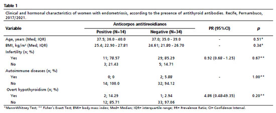 9,10Given these uncertainties, this study aimed to evaluate the ovarian reserve of women with endometriosis, based on the positivity of anti-thyroid antibodies.