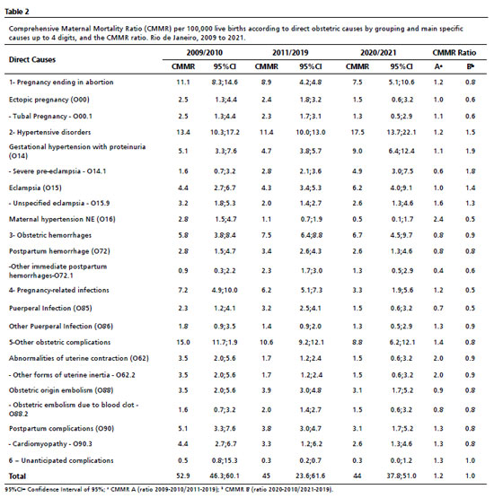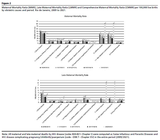For 2020 and 2021, the maternal mortality ratio (MMR) per 100,000 live births (LB) in Brazil reached 74.7 and 117.4, respectively. The main causes of death showed little variation, except for COVID-19, which experienced an atypical increase in recent years.3