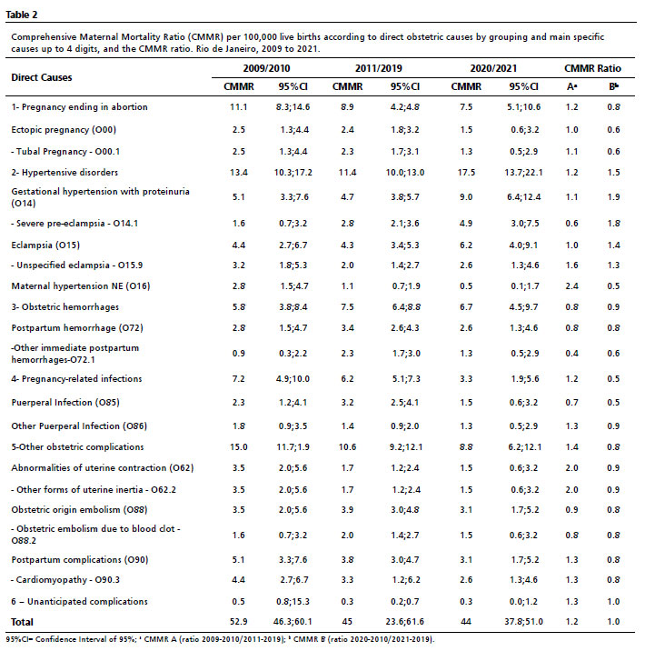 Obstetric causes (chapter XV) of maternal (underlying cause) and late deaths (cause associated with O96, which corresponds to the underlying cause in its absence) were analyzed according to an adapted ICD-MM classification.6 The ICD-MM classification of maternal death causes groups obstetric causes into direct, indirect, and unknown.7 The direct causes are grouped into six categories: 1- Abortion (O00-O07), 2- Hypertension (O11-O16), 3- Hemorrhages (O20; O43-O46; O67; O71.0; O71.1, O71.3, O71.4, O71.7; O72), 4- Infections (O23; O41.1; O75.3; O85-O86; O91), 5- Other obstetric complications (O21.1, O21.2; O22; O24.4; O26.6, O26.9; O41.0, O41.8, O71.2, O71.5, O71.6, O71.8, O71.9; O73; O75.0-O75.2, O75.4-O75.9; O87.1, O87.3, O87.9; O88; O90); 6- Unanticipated complications, generally related to anesthetic procedures (O29; O74; O89). The indirect causes are represented by group 7, consisting of all non-obstetric complications (O10; O24.0, O24.2, O24.3, O24.9; O98 [including B20-24, recoded as O98.7], O99), and the unknown causes, group 8, by the ICD O95 code. Group 9, corresponding to causes of death occurred during pregnancy, childbirth, and the postpartum period due to external causes (coincident causes) was not analyzed. Mendonça et al.6 adapted the original ICD-MM,7 including the codes O30-O36, O40, O41.9, O42; O60-061 and 063-066 in group 5.6 Since 2012, the WHO has suggested the use of code O98.7 to classify indirect obstetric maternal deaths from HIV/aids.7 In Brazil, the SIM began to classify HIV/aids outside Chapter I (B20-B24) as code O98.7 (Chapter XV) from 2020. We adopted the code O98.7 for maternal and late maternal deaths to the entire analysis period.