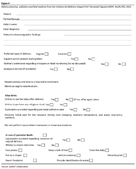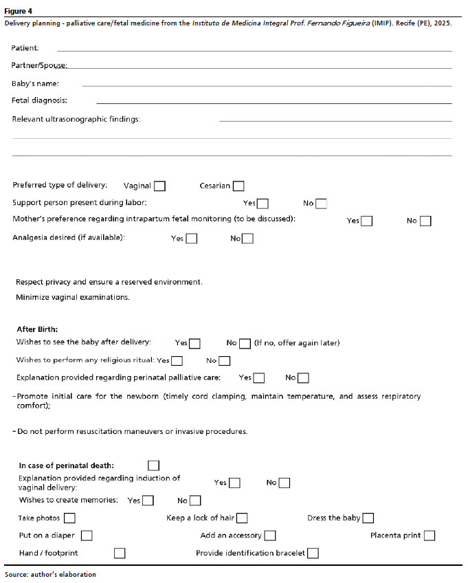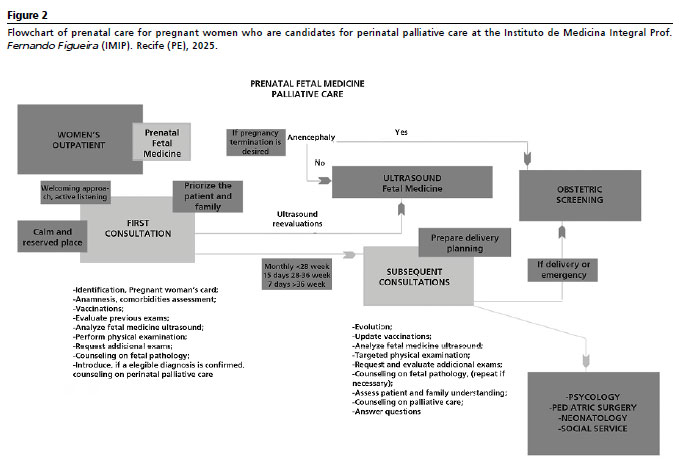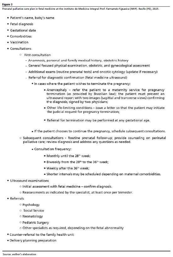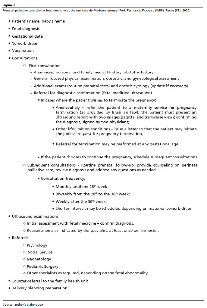 The selected articles were analyzed, highlighting available resources and the experience in care in the fetal medicine unit at IMIP. Based on these sources, the concept of perinatal palliative care, the eligible fetal anomalies and their diagnostic criteria, communication guidelines, prenatal and delivery care, bereavement, and postpartum approaches were defined, and besides the development of a birth plan to be discussed with patients and families during prenatal care, was also included.