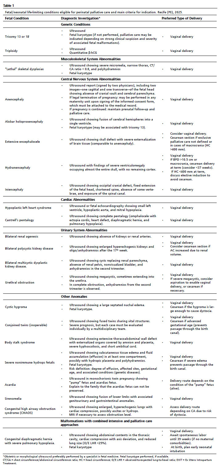 The indication for palliative care should consider fetal diagnosis and prognosis, as well as the personal meaning of the condition for the patient and her family.9,19 Several anomalies identifiable during pregnancy may have a limited prognosis and should be reassessed after birth (Table 1).3,12,14,15,18,20 Palliative care may coexist with intensive care approaches when appropriate, as any patient with a life-threatening condition can receive palliative care, even if death is not imminent.17 However, in cases involving long-term life-limiting conditions, palliative care is often ethically more appropriate than intensive interventions, as it prevents suffering without altering the outcome.9,21 In addition to the listed conditions, other anomalies may be considered on a case-by-case basis, depending on prognosis and therapeutic resources available (e.g., complex congenital heart disease, large fetal tumors, airway obstructions, rare syndromes). When prognosis is uncertain, a multidisciplinary clinical meeting should be convened for discussion and consensual inclusion in palliative care. Neonatal follow-up may redirect the therapeutic plan according to the newborn's clinical evolution, family values, and available healthcare resources.