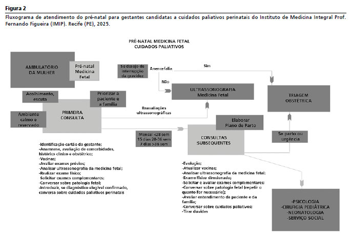 22,23Consideração finaisEste protocolo resulta de uma síntese crítica da literatura nacional e internacional, adaptada à realidade de uma maternidade de alto risco do Nordeste brasileiro. O IMIP, instituição filantrópica pertencente ao sistema único de saúde (SUS), ainda que tenha recursos diagnósticos e assistenciais limitados, é uma referência na região e atende um grande quantitativo de pacientes de alta complexidade. A criação deste modelo de atendimento visa padronizar fluxos internos, melhorar a comunicação interprofissional e orientar decisões compartilhadas do pré-natal ao puerpério. Por seu caráter pragmático e baixo custo adicional (essencialmente inerente ao internamento), o modelo é replicável em centros com perfil semelhante, favorecendo redes multiprofissionais aptas a prover cuidados paliativos perinatais centrados na família. Recomenda-se sua implementação com educação permanente; monitoramento de indicadores (adesão ao plano de parto, proporcionalidade de intervenções, encaminhamentos para Psicologia/Serviço Social); e com revisões periódicas de acordo com a demanda, assegurando atualizações constantes para garantir a qualidade da assistência em cuidados paliativos perinatais.