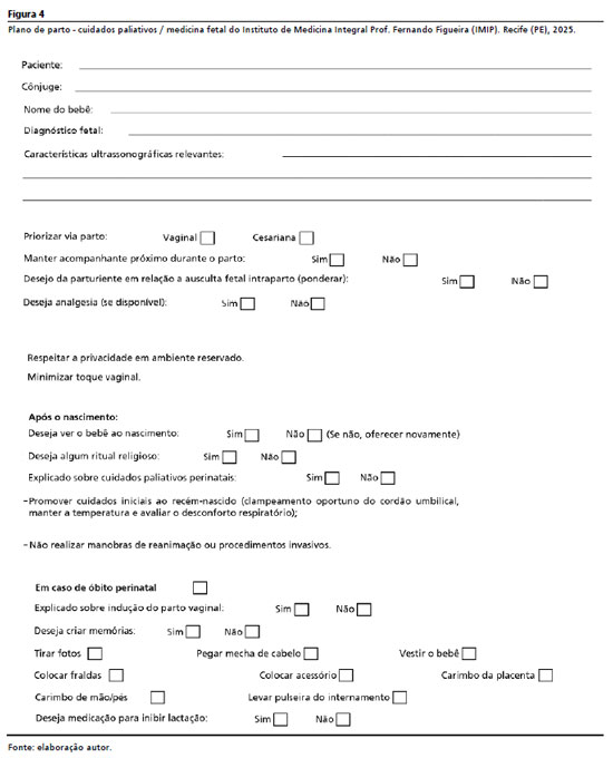 11,19 O plano deve ser elaborado em conjunto com familiares e obstetras, neonatologistas e especialistas em cuidados paliativos perinatais, sendo uma oportunidade de explorar e documentar os desejos das pacientes.