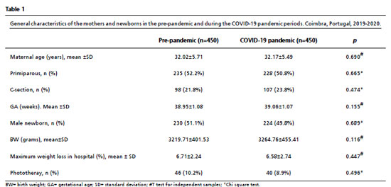 ResultsA total of 900 mother–newborn dyads were included, 450 in each period (pre-pandemic and pandemic). The number of full-term deliveries per month was similar over the periods.