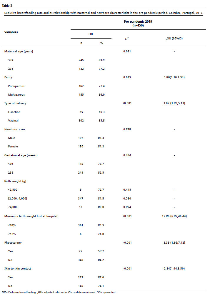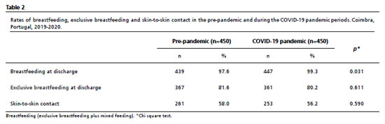 RESULTS: breastfeeding rates were higher in the pandemic period (99.3%) than in the pre-pandemic period (97.6%; p=0.031). Exclusive breastfeeding (80.2% vs. 81.6%; p=0.611) and skin-to-skin contact (56.2% vs. 58.0%; p=0.590) did not differ significantly. Exclusive breastfeeding was associated with vaginal delivery (pre-pandemic OR=3.07; 95%CI=1.83-5.13; p<0.001; pandemic OR=2.29; 95%CI=1.39-3.77; p=0.001), weight loss <10% (p<0.001), and absence of phototherapy in the pre-pandemic period (OR=3.38; 95%CI=1.96-7.12; p<0.001). No associations were found with maternal age, parity, sex, or gestational age.