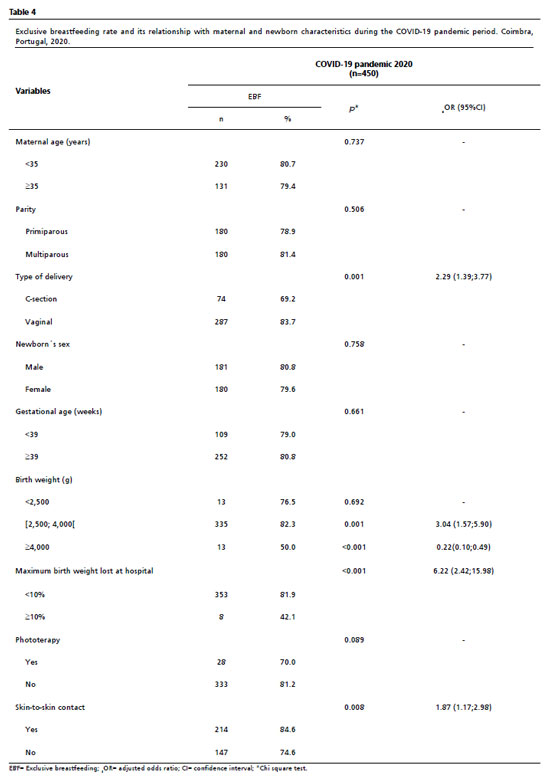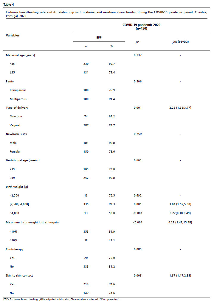 Analysis of factors associated with exclusive breastfeeding in the pre-pandemic (Table 3) and in the COVID-19 pandemic period (Table 4) revealed no relation with maternal age, gestational age, or newborn sex in either period. In both periods, vaginal delivery (pre-pandemic OR=3.07, 95%CI= 1.83;5.13;