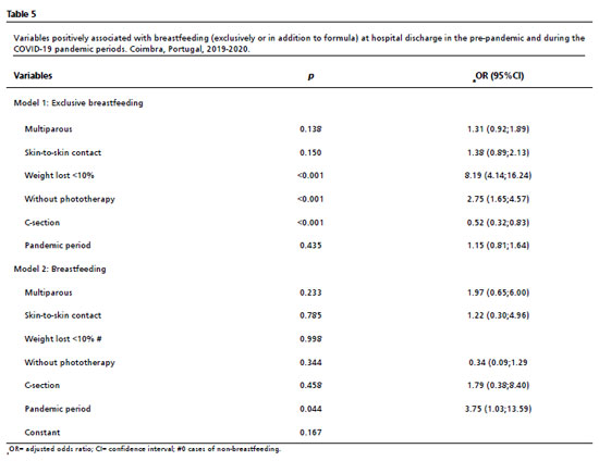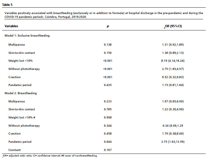 p<0.001). Of the 26 macrosomic newborns in the pandemic period sample, only 50% were discharged with exclusive breastfeeding, but all were discharged with any breastfeeding (exclusive breastfeeding or mixed feeding), reflecting a greater use of formula milk. In the group of low-birth-weight newborns, there were no differences in exclusive breastfeeding rates in relation to the other weight groups in both periods. In both periods, newborns with a weight loss below 10% during hospitalization had greater odds of exclusive breastfeeding (