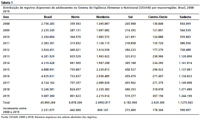 Considerou-se os dados do estado nutricional e da cobertura de adolescentes acompanhados no sistema, possibilitados pelas consultas aos relatórios consolidados, de acesso público e disponíveis no endereço eletrônico do SISVAN
