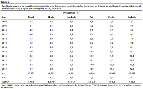 RESULTS: an increase in the prevalence of obesity was observed between 2008 and 2019, during this period thinness remained stable in Brazil. National coverage evolved from 9.3% in 2008 to 19.6% in 2019, with an annual variation of 9% and a statistically significant increase trend. In Brazil, obesity in this age group increased between 2008 and 2019, with an annual variation of 8.7% (CI95% = 7.8-9.6).