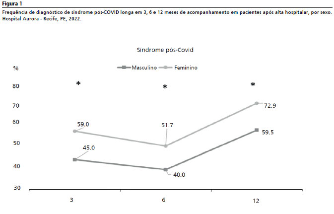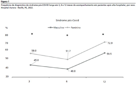 Quando avaliados em relação à LPCS, os doentes com LPCS eram mais jovens (p=0,024) e do sexo masculino (p<0,001). Não houve diferenças significativas em relação à etnia, escolaridade, comorbidades, necessidade de internação em UTI, uso de drogas vasoativas, hemodiálise e/ou ventilação mecânica (Tabela 2). No entanto, ao final de três, seis e 12 meses de seguimento, as mulheres foram mais frequentemente referidas como tendo LPCS (59% versus 45%; p<0,001), (51,7% versus 40%; p<0,001) e (72,9% versus 59,5%; p<0,001), respetivamente. Além disso, houve um aumento da frequência da síndrome pós-covid longo ao longo do tempo em ambos os sexos, atingindo seu pico de frequência aos 12 meses de seguimento, acometendo principalmente o sexo feminino (Figura 1).