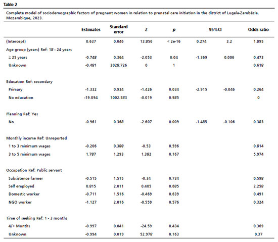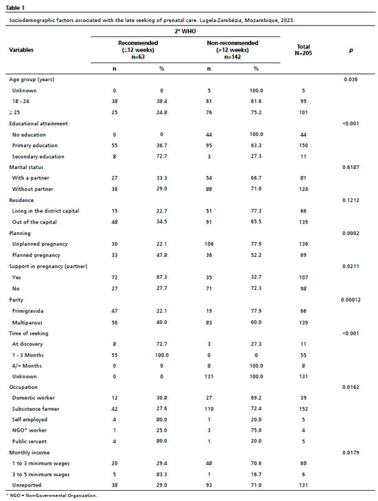 OBJECTIVES: to analyze the factors associated with late prenatal care attendance by pregnant women at the Lugela health center in the first quarter of 2023.