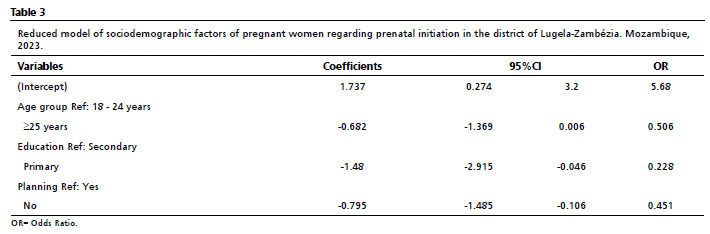 For the education variable, women who reported having a primary or no education had a 22.8% reduced chance of seeking prenatal care in the first months after conception compared to those with a secondary education (OR=0.228, 95%CI= -2.915 to -0.046). Regarding maternal age, women aged 25 or older had a 50.6% reduced chance of seeking prenatal care in the first twelve weeks of gestation compared to those who were younger (OR=0.506, 95%CI= -1.369 to 0.006). As for pregnancy planning, women who reported not having planned their pregnancy had a 45.1% reduced chance of complying with the recommended period for prenatal care compared to those who had planned their pregnancy (OR=0.451, 95%CI= -1.485 to -0.106) (Table 3).