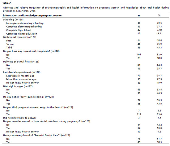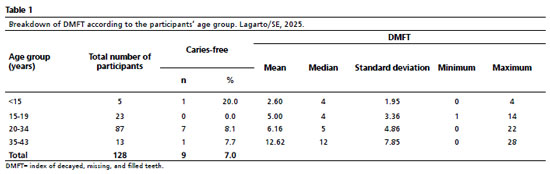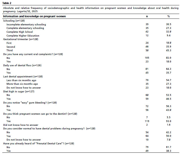 ResultsA total of 128 women with a mean age of 25.1 ± 6.82 years participated in the study. The mean DMFT index was 6.5 (±5.4). Table 1 details the DMFT according to the participants' age group and presents the absolute and relative number of women free of caries. Only nine women (7.03%) were free of caries. Most participants had completed high school and were in their third trimester of pregnancy. Regarding oral health information, most had no oral health complaints at the time of the interview, reported not flossing daily, had no gum bleeding, had their last dental appointment in the last six months, reported not consuming diets rich in sugary food, and were unaware of the term "prenatal dental care". The average daily toothbrushing was 2.83 ± 0.66. Table 2 shows the complete distribution of these variables.