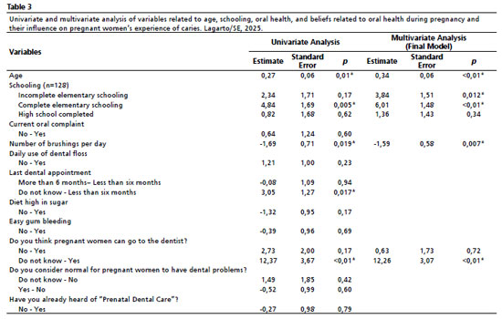 30In the present research, oral health issues such as flossing and number of daily brushings could have been addressed in a prenatal dental consultation and helped protect against caries, since our regression model indicated that each additional brushing per day was significantly associated with a 1.69 reduction in DMFT. It should be noted that including oral health education in prenatal care can contribute to greater knowledge among vulnerable pregnant women and, consequently, greater empowerment, participation in care and decisions, and the adoption of healthy habits, reflecting in improved health for women and their children.