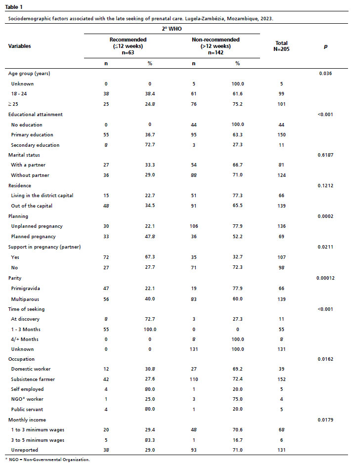 13Therefore, the present study aimed to analyze factors associated with the delayed initiation of prenatal care at the Lugela health center.