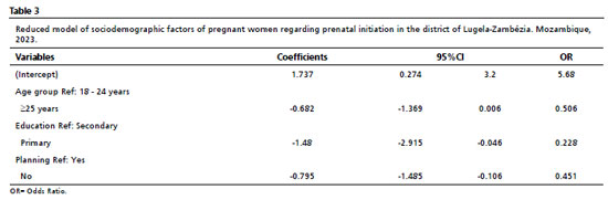 For the education variable, women who reported having a primary or no education had a 22.8% reduced chance of seeking prenatal care in the first months after conception compared to those with a secondary education (OR=0.228, 95%CI= -2.915 to -0.046). Regarding maternal age, women aged 25 or older had a 50.6% reduced chance of seeking prenatal care in the first twelve weeks of gestation compared to those who were younger (OR=0.506, 95%CI= -1.369 to 0.006). As for pregnancy planning, women who reported not having planned their pregnancy had a 45.1% reduced chance of complying with the recommended period for prenatal care compared to those who had planned their pregnancy (OR=0.451, 95%CI= -1.485 to -0.106) (Table 3).