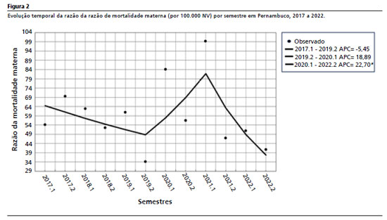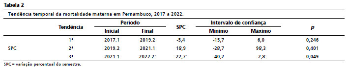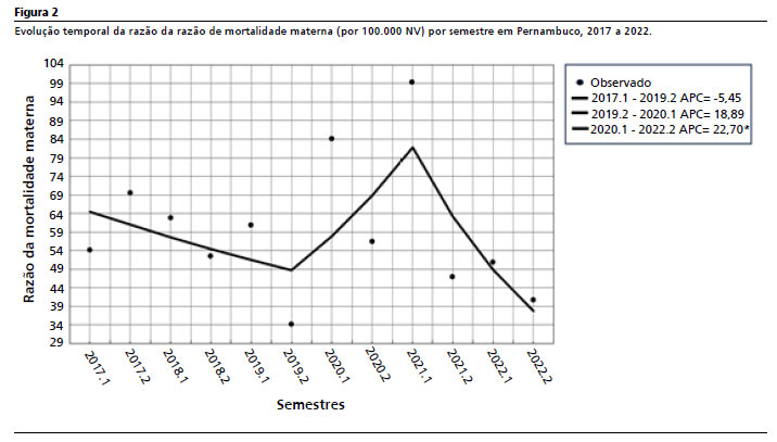 14In order to assess the temporal impact of COVID-19, we analyzed the MMR trend in Pernambuco from 2017 to 2022, with a semester-based disaggregation (12 observations). We applied the Joinpoint regression model, which identifies significant changes in trends and estimates the Semestral percent change (SPC), with 95% confidence intervals and 5% significance level.