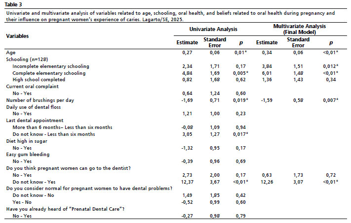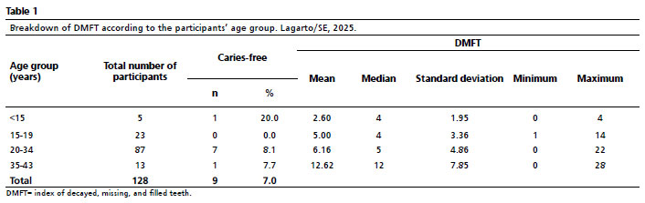 ResultsA total of 128 women with a mean age of 25.1 ± 6.82 years participated in the study. The mean DMFT index was 6.5 (±5.4). Table 1 details the DMFT according to the participants' age group and presents the absolute and relative number of women free of caries. Only nine women (7.03%) were free of caries. Most participants had completed high school and were in their third trimester of pregnancy. Regarding oral health information, most had no oral health complaints at the time of the interview, reported not flossing daily, had no gum bleeding, had their last dental appointment in the last six months, reported not consuming diets rich in sugary food, and were unaware of the term "prenatal dental care". The average daily toothbrushing was 2.83 ± 0.66. Table 2 shows the complete distribution of these variables.