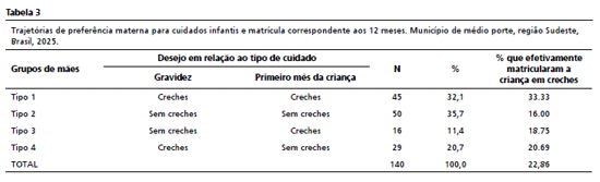 Este estudo destaca a lacuna entre intenção materna e uso real de cuidados infantis formais durante o primeiro ano de vida da criança. Embora muitas mães tenham inicialmente expressado o desejo de matricular seus filhos em creches, essa preferência muitas vezes diminuiu após o nascimento, e apenas uma minoria de crianças foi matriculada aos 12 meses de idade. Maior escolaridade materna surgiu como fator-chave associado à concretização desta intenção.