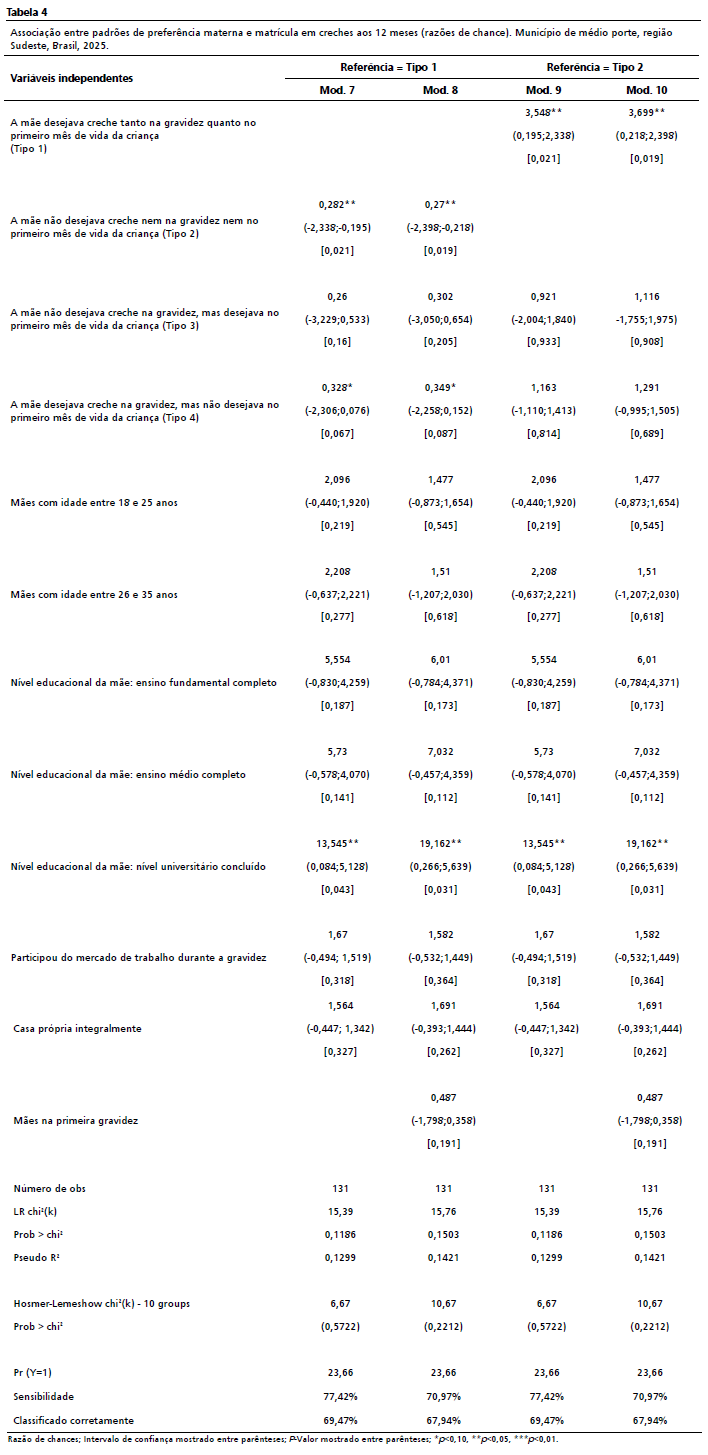 Para explorar o papel da estabilidade da preferência, uma variável categórica representando quatro tipos de trajetórias de desejo materno (Tipos 1–4) foi incluída em regressões adicionais (Tabela 4). Em comparação com as mães que pretendiam consistentemente matricular os filhos em creches (Tipo 1), todos os outros grupos apresentaram menor probabilidade de matrícula. Essa diferença foi estatisticamente significativa (pelo menos 90% de confiança) somente quando comparada aos Tipos 2 e 4. O maior efeito negativo (72% menos probabilidade de matricular em creches) foi observado entre mães que consistentemente pretendiam não inscrever (Tipo 2). Quando o Tipo 2 foi usado como referência, não foram encontradas diferenças significativas entre ele e os Tipos 3 e 4. Isso sugere que manter uma intenção positiva ao longo do tempo estava mais fortemente associada à matrícula efetiva do que simplesmente mudar de ideia.