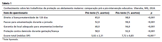 MÉTODOS: estudo quase experimental, realizado entre maio e agosto de 2024, em enfermarias de Alojamento Conjunto de um hospital universitário de Minas Gerais, com inclusão de 50 puérperas que exerciam atividade laboral remunerada e intencionavam amamentar. O conhecimento materno foi avaliado por questionário validado aplicado antes e após exibição de vídeo educativo sobre a legislação vigente. Para avaliar o efeito da intervenção educativa, foi aplicado o teste t-pareado, com significância de p≤0,05.
