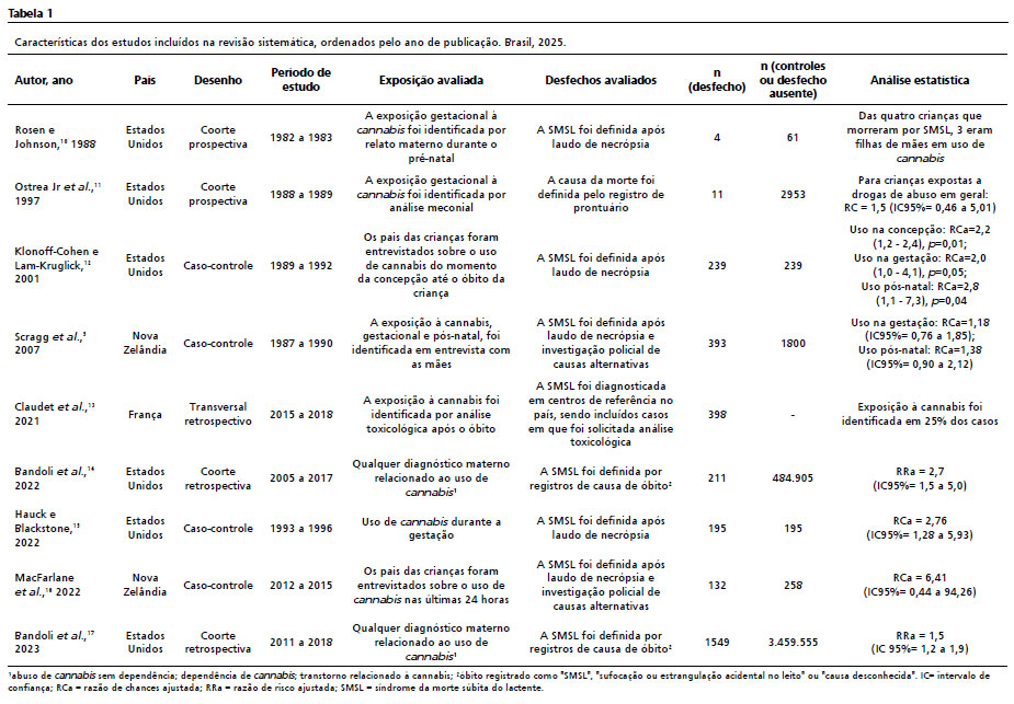 ® de forma independente e padronizada, e possíveis divergências foram definidas por um terceiro autor. Primeiro foram lidos os títulos e resumos e, em uma segunda fase, os artigos completos. Os critérios de inclusão foram: (i) estudos que avaliaram exposição à cannabis, em qualquer dose ou via, durante o período gestacional ou pós-natal, (ii) estudos que tiveram como desfecho a síndrome da morte súbita do lactente, e (iii) estudos com desenho de caso-controle, coorte ou transversal retrospectivo. Já os critérios de exclusão foram: (i) estudos com exposições ou desfechos diferentes dos determinados nos critérios de inclusão, (ii) estudos de revisão, protocolos clínicos, relatos de casos, e (iii) e estudos publicados na forma de capítulo de livro, resumo de conferências, cartas ao editor ou editoriais.