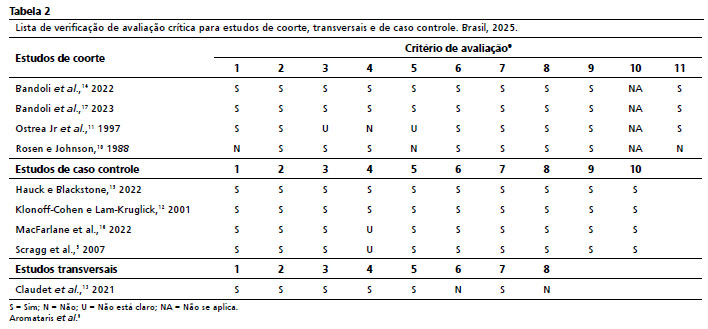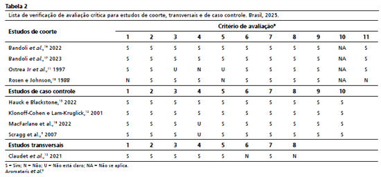 The Joanna Briggs Institute (JBI), usando a lista de verificação para estudos de coorte, estudos transversais e de caso controle.