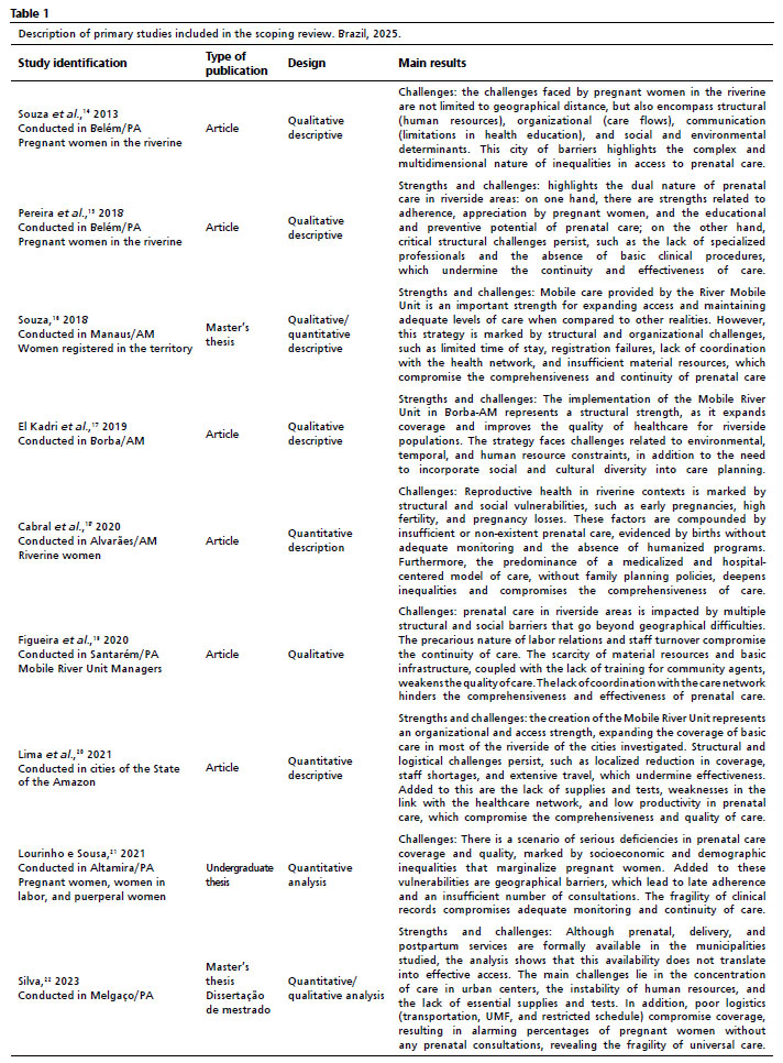 The nine studies included on prenatal care for pregnant women living in riverine communities in Brazil