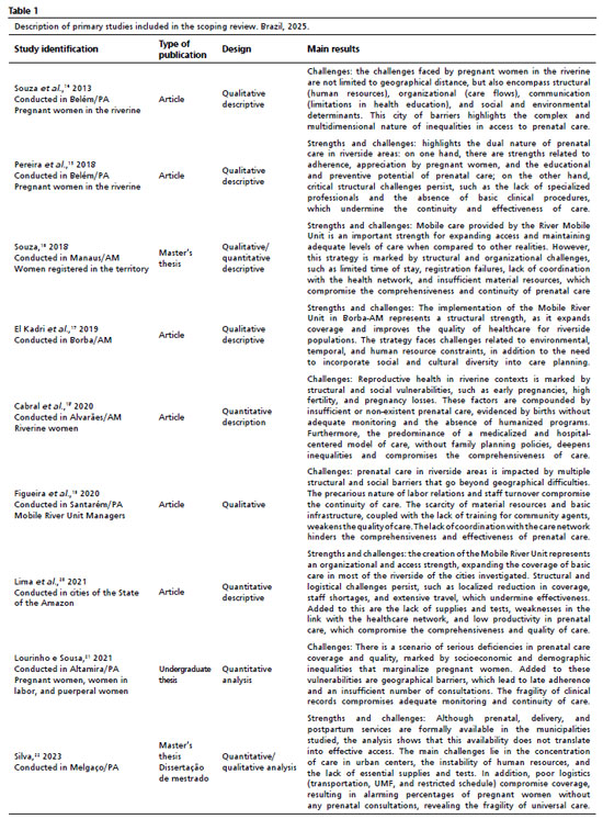 Final considerationsThis scoping review identified both positive aspects and significant challenges in the context of prenatal care for pregnant women living in riverine communities in Brazil. The studies show that, despite local initiatives and the dedicated work of health professionals, such as nurses, care is still fragmented and limited. This reflects inequalities in access to and quality of health care.
