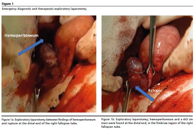 13 The standard treatment for ruptured ectopic pregnancy is surgery via laparoscopy or laparotomy. In our case, we performed a total salpingectomy of the right tube and removal of the ectopic pregnancy by laparotomy, as the center did not have laparoscopic equipment.