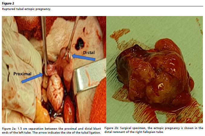 DESCRIPCIÓN: se presenta el caso de un embarazo ectópico roto después de una esterilización tubárica postparto vaginal. Mujer de 33 años es admitida después de haber presentado dolor abdominal bajo durante 4 días y amenorrea de 8 semanas, cuatro embarazos, cuatro partos vaginales, esterilización quirúrgica según la técnica de Pomeroy realizada durante el último parto, siete años atrás. Subunidad β positiva y la ecografía transvaginal mostró un útero vacío, una masa heterogénea de 55×44 mm por debajo del ovario derecho y presencia de abundante líquido. Sobre la base de los signos clínicos, prueba de embarazo e imágenes, se sospechó un embarazo ectópico derecho. Se realizó una laparotomía exploratoria, encontrándose coágulos oscuros y sangre, un hemoperitoneo de 2500 cc y una tumoración de 4 x 5 cm en muñón distal con sangrado activo a nivel de fimbrias.
