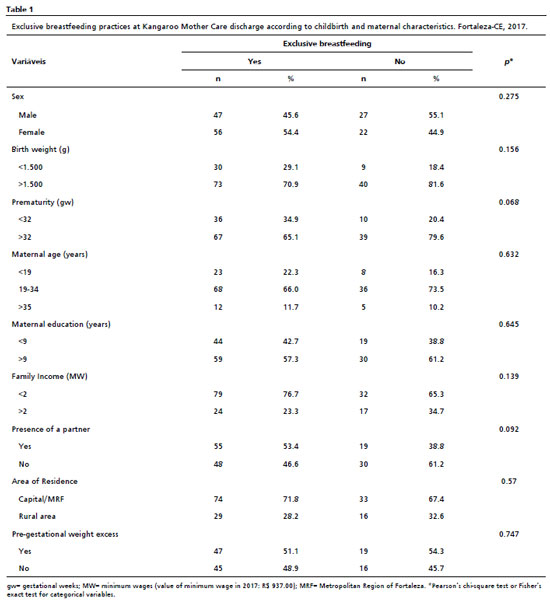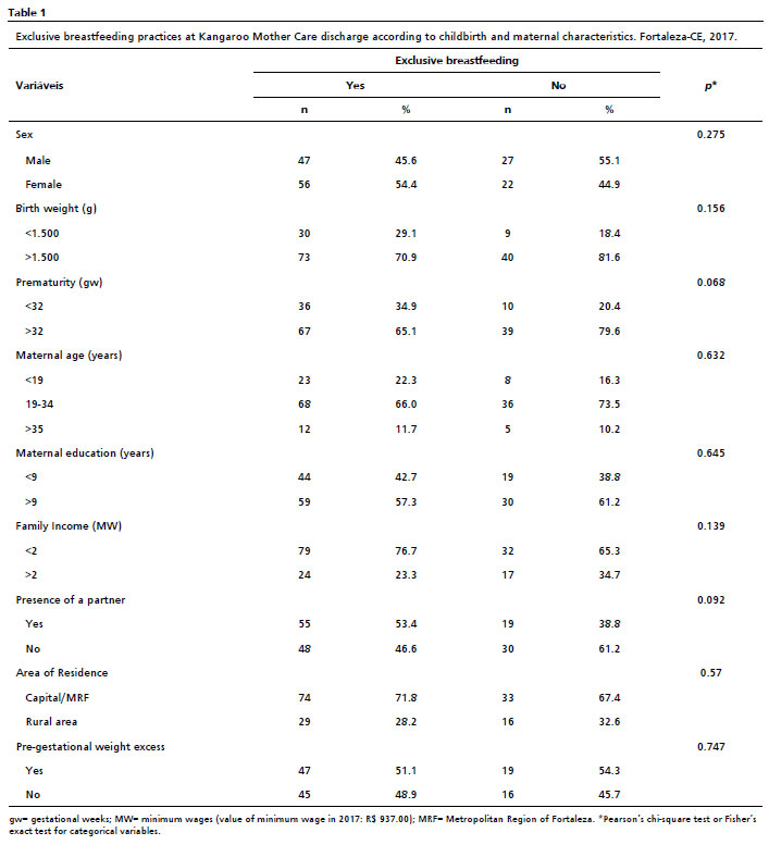 The practice of EBF at KMC discharge was defined as the independent variable, determined after the repeated anthropometric measures. It was classified as yes (newborns who remained exclusively breastfed throughout the three KMC stages) and no (newborns who discontinued EBF before KMC discharge). In the third stage, at each appointment, mothers reported the provision of breast milk, as well as other liquids such as water, tea, formulas, cow's milk, and food. Data on newborn characteristics (sex, birth weight, and gestational age) and maternal characteristics (age, educational attainment, income and pre-gestational BMI) were collected during the initial interview.