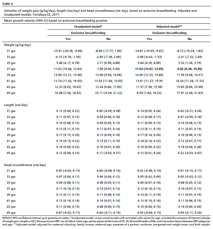 RESULTS: overall, 51.3% of the infants were female, with a mean birth weight of 1,743 g (±43.8) and a mean gestational age of 32.7 weeks (±2.1). At 37 weeks of age, exclusively breastfed infants showed higher weight gain velocity (11.8 g/kg/day; 95%CI= 10.7-12.9) compared with those not exclusively breastfed (8.4 g/kg/day; 95%CI= 6.4-10.5; p<0.05). No statistically significant differences were observed in length or head circumference trajectories between feeding groups.