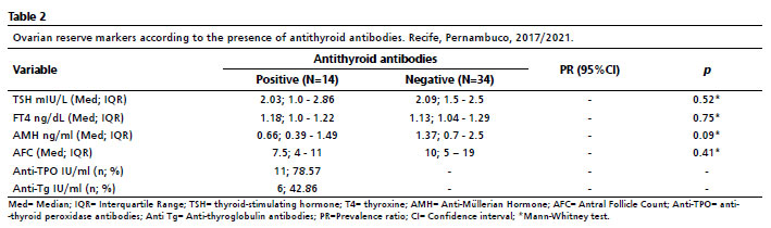 MÉTODOS: estudo transversal retrospectivo realizado em clínicas de reprodução assistida em Recife, Pernambuco, entre fevereiro de 2017 a agosto de 2021. Foram incluídas mulheres de 18 a 49 anos, com diagnóstico de endometriose e dosagem registrada de anticorpos antitireoidianos (anticorpos anti-tireoperoxidase – anti-TPO e antitireoglobulina – anti-Tg), hormônio anti-mulleriano (HAM) e contagem de folículos antrais (CFA). Foram excluídas outras causas de baixa reserva ovariana. As variáveis numéricas foram comparadas pelo teste de Mann-Whitney (grupos com e sem anticorpos), considerando p<0,05. Resultados: foram analisados 48 prontuários de mulheres elegíveis com prevalência de 29,2% de mulheres com anticorpos antitireoidianos positivos e 70,8% negativos. A mediana do HAM foi de 0,66 ng/mL no grupo positivo e 1,37 ng/mL no grupo negativo (p=0,09), e a CFA foi de 7,5 e 10,0, respectivamente (p=0,41).