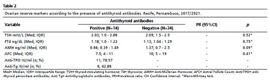 METHODS: retrospective cross-sectional study conducted in assisted reproduction clinics in Recife, Brazil, from February 2017 to August 2021. Women aged 18-49 years with endometriosis and recorded measurements of anti-TPO and/or anti-Tg, anti-Müllerian hormone (AMH), and antral follicle count (AFC) were included. Women with other causes of diminished ovarian reserve were excluded. Numerical variables were compared using the Mann-Whitney test, with p<0.05 considered significant.