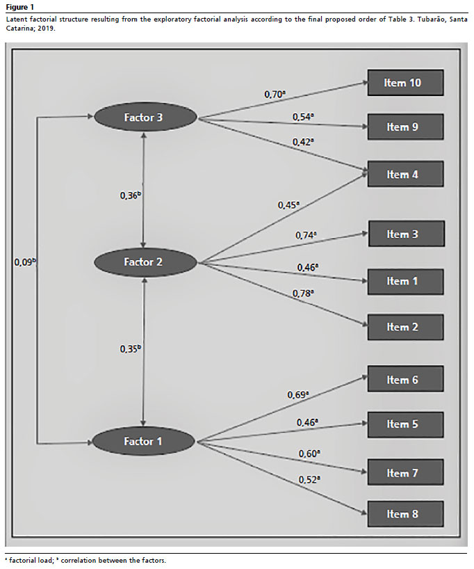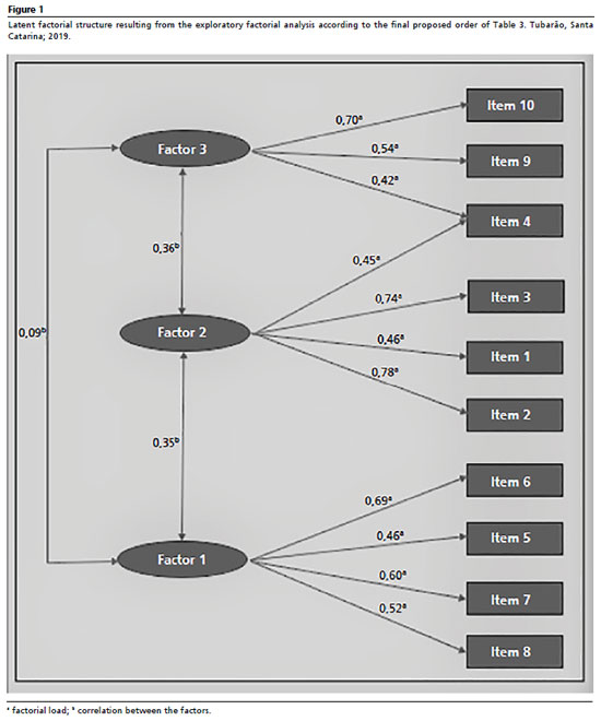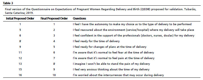 Analysis of the 22 items comprising the questionnaire in the pilot test showed that: 1) Some items were not observable aspects of the latent trait of interest, as they involved questions related to maternity and not only to delivery (questions 18 to 22); 2) Some items were expressing a reality already experienced with more focus than an expectation in itself, as in questions 2, 3 and 17; 3) Some items were overlapping, as they intended to measure the same characteristic through different questions, as in questions 4 and 8; 6 and 7; 9 and 10, with the most comprehensive question chosen in each case. These issues were discussed by the research team and, along with the instrument's reliability analysis, led to the removal of several questions from the final version of the questionnaire, resulting in a proposed final instrument composed of 10 items (Table 3).