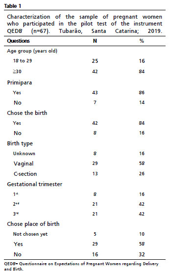 Table 1 displays the characteristics of the pregnant women who completed the proposed instrument in its first version.