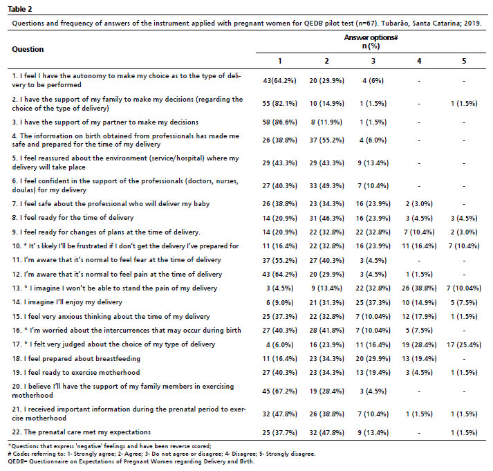Table 2 describes the frequencies of responses to the questions of the proposed instrument in its complete version used in the pilot test. Questions concerning the choice of type of delivery and family support (1, 2, 3 and 20) were those with the highest frequency of affirmative answers.