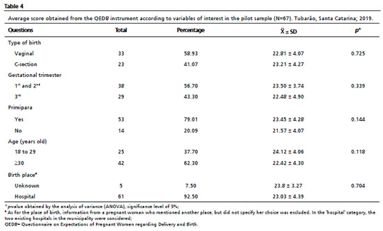 The mean score obtained in the pilot test was 23.06 (±4.28), with a minimum score of 12 and a maximum score of 34. The average score was 24.13 ±4.23 for primigravidae women aged 18 to 29 years old, and 24.00 ±2.82 for multiparous women of the same age group. The primigravidae ≥30 had a score of 22.93 ±4.31, and the multiparous women of the same age group had a score of 21.16 ±4.19. There was no significant difference in the average total score between primigravidae and multiparous women. The total score was lower for women aged 30 years or older, and women who were in the third trimester had a lower score (more positive expectation with childbirth), but without statistically significant differences. The same trend was observed in the score of women who chose vaginal birth; they had a lower score (higher expectation) but there was no significant difference either (Table 4).